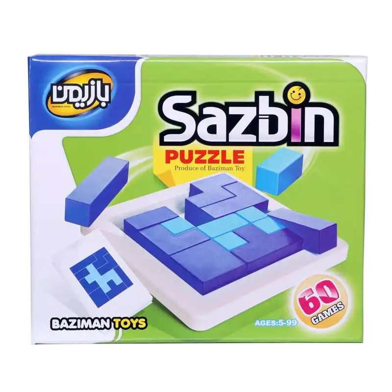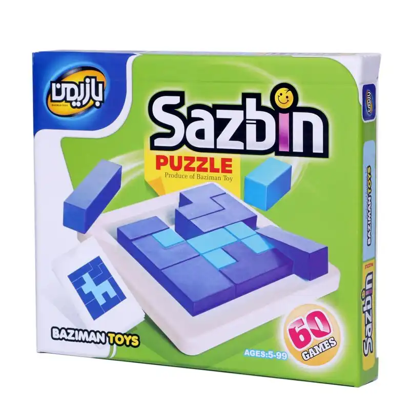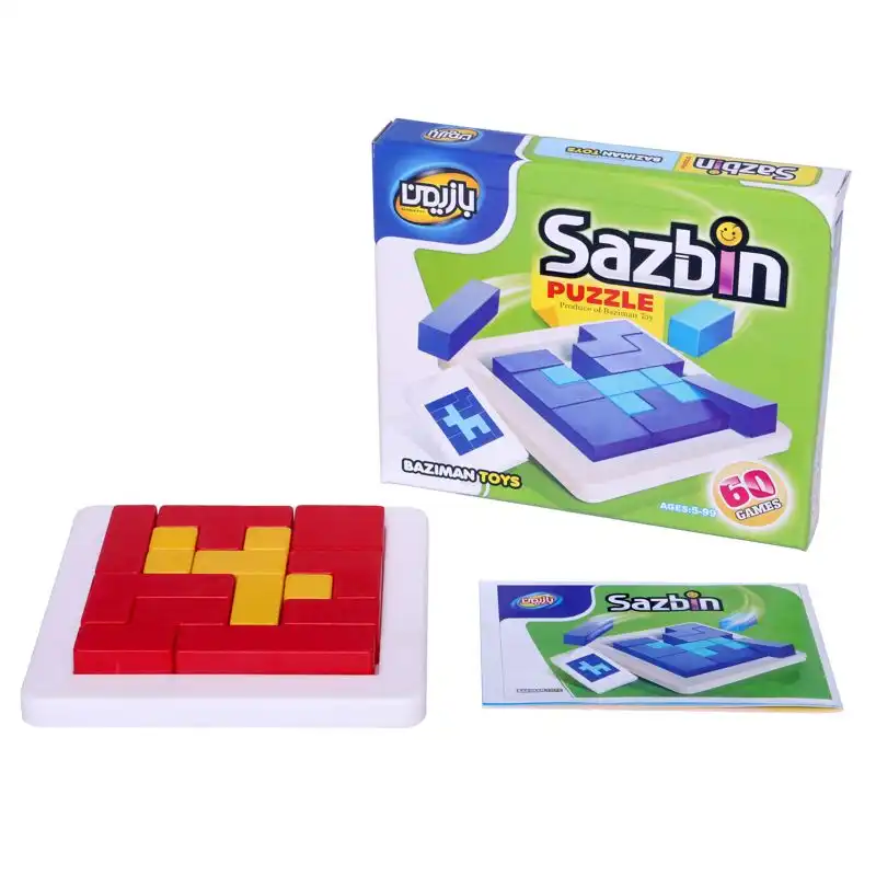 سازبین یک بازی معمایی حاوی ۱۴ قطعه پازل به اشکال مختلف در دو رنگ و یک دفترچه شامل ۶۰ معماست.